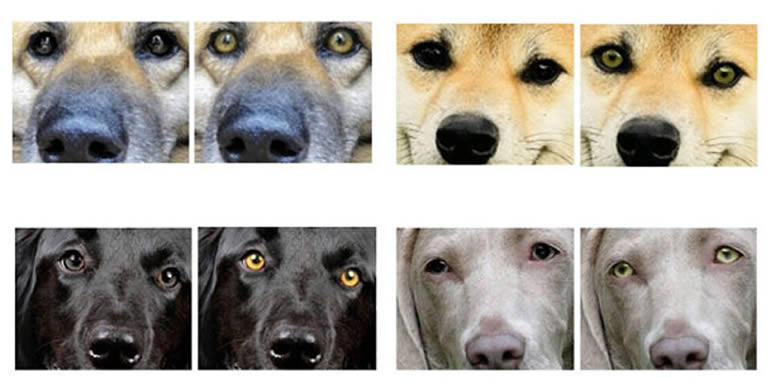 На фотографиях были видны только собачьи глаза, смотрящие вперед, и нос – так учёные свели к минимуму влияние посторонних факторов, типа формы головы или длины ушей. Кроме того, они использовали пары изображений, на одном из которых глаза были естественного цвета, а на другом – искусственно осветленные, что делало их похожими на волчьи.