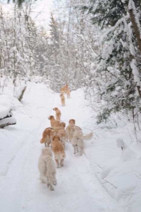 Фотозарисовка о нашей совместной зимней прогулке по лесу с командой золотистых ретриверов из питомника Амберголд